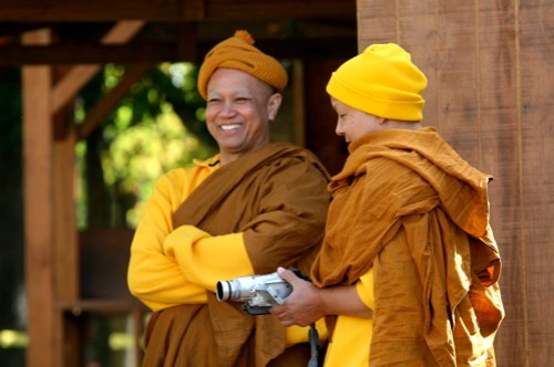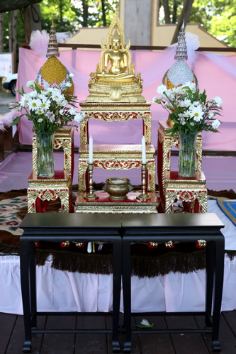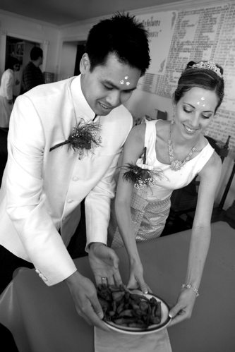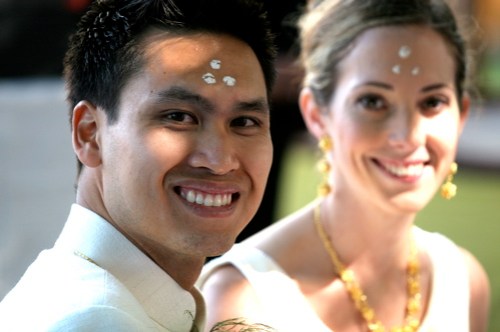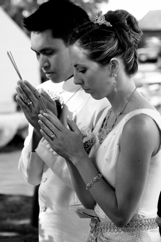 the buddhist ceremony: peter + mary bowed before the image of the buddha as the monks of the monastery looked on. together they recited buddhist prayers and chants, lit candles and incense before the image, and made offerings of flowers to the monks. they were each anointed with three white dots on their foreheads, made of powder and blessed by the monks. afterwards, the couple entered the monastery to present offerings of food to the monks – their first “act of merit” or good deed, performed together. this action served to link their good deeds together and signifies that they are destined to be together forever.