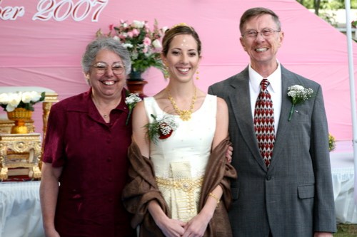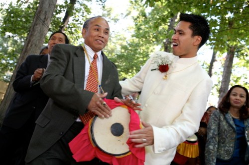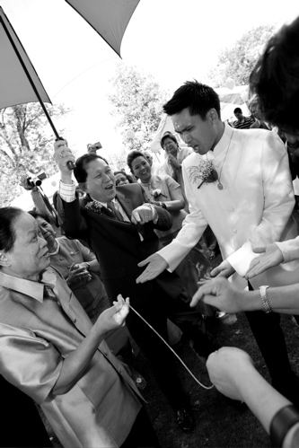 the groom’s processional: peter and his family gathered at the entrance to the monastery and began their “entrance” – thai drums beating alongside him, peter led the way, with everyone chanting, singing, and dancing behind him…guests lined their path clapping and cheering them on. when peter reached the archway where mary waited with her parents, he had to find a way to “pay his way” in order to “pass through”…he dug in his pockets searching for adequate gifts! it was hilarious! everyone helped him out, he was allowed to pass, and greeted his bride enthusiastically with a kiss…