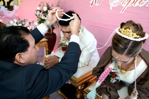 holy thread blessing: at this point the couple knelt side by side while white yarn headpieces called monkols were placed on the crown of their heads. connected to each other by a string, this holy looped thread is a symbol of unity and matrimony and “binds” them together as a couple. a puang malei, or floral lei, was also placed around the neck of both the bride and groom.