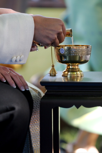 water blessing ceremony: using the sacred conch shell, guests took turns pouring blessed water over the hands of the bride and groom – a sign of respect and love, and an opportunity to intimately congratulate them.
