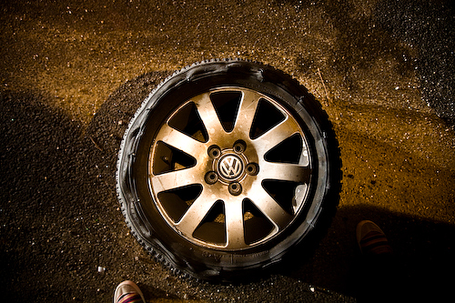 it wasn’t until i was coming into the city on new york avenue that i noticed something wasn’t right with my car. i heard a rumbling sound and immediately freaked out. as much as i love my adorable passat, i’ve had more complications with this vehicle than any of the other dozen cars i’v owned in my lifetime. slowing down at a light, i realized that the sound i was hearing was a (shockingly my first ever!) flat tire. no big deal i thought (stupidly), refusing to pull over and investigate due to my undesirable location. also, i was less than 5 miles from home, so i decided to push on. this is when the rumbling progressed to a loud flapping, and i began to feel like i was driving on a time bomb. i rolled down the passenger window to get a better listen and was overwhelmed by the stench of burning rubber. not good. dialing roadside assistance, i continued to drive, slowly, with hazards on, down ny ave. – much to the chagrin and utter aggravation of my fellow drivers. let’s just say i got the finger at least a few times, and more honking than i heard from the crazed taxi drivers in south america.